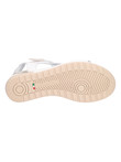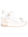 Sandalo Nero Giardini da donna in pelle bianca con dettagli dorati, stretch regolabile e pietre. Fodera e sottopiede sempre in pelle, fondo in gomma antiscivolo e zeppa di 8cm.