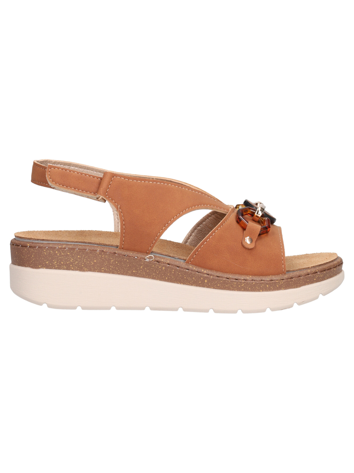 Sandalo Valleverde da donna in ecopelle cuoio con plantare estraibile in vera pelle, fondo in gomma e zeppa di 4cm.