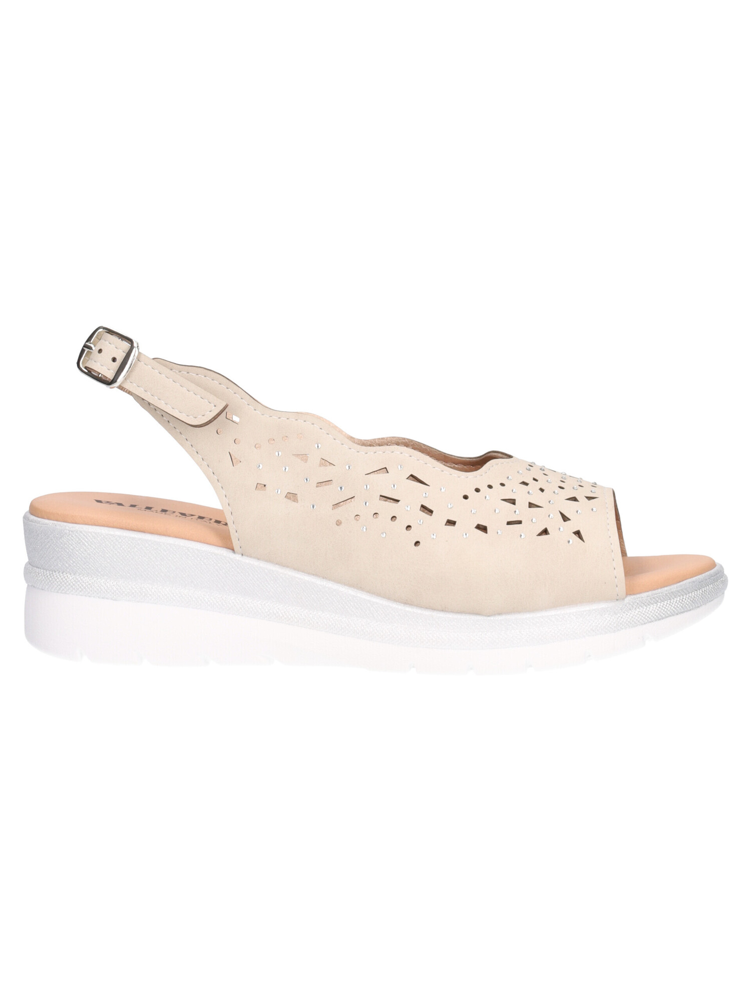 Sandalo Valleverde da donna in ecopelle beige con strass, sottopiede imbottito in vera pelle, fondo in gomma e zeppa di 4,5cm.