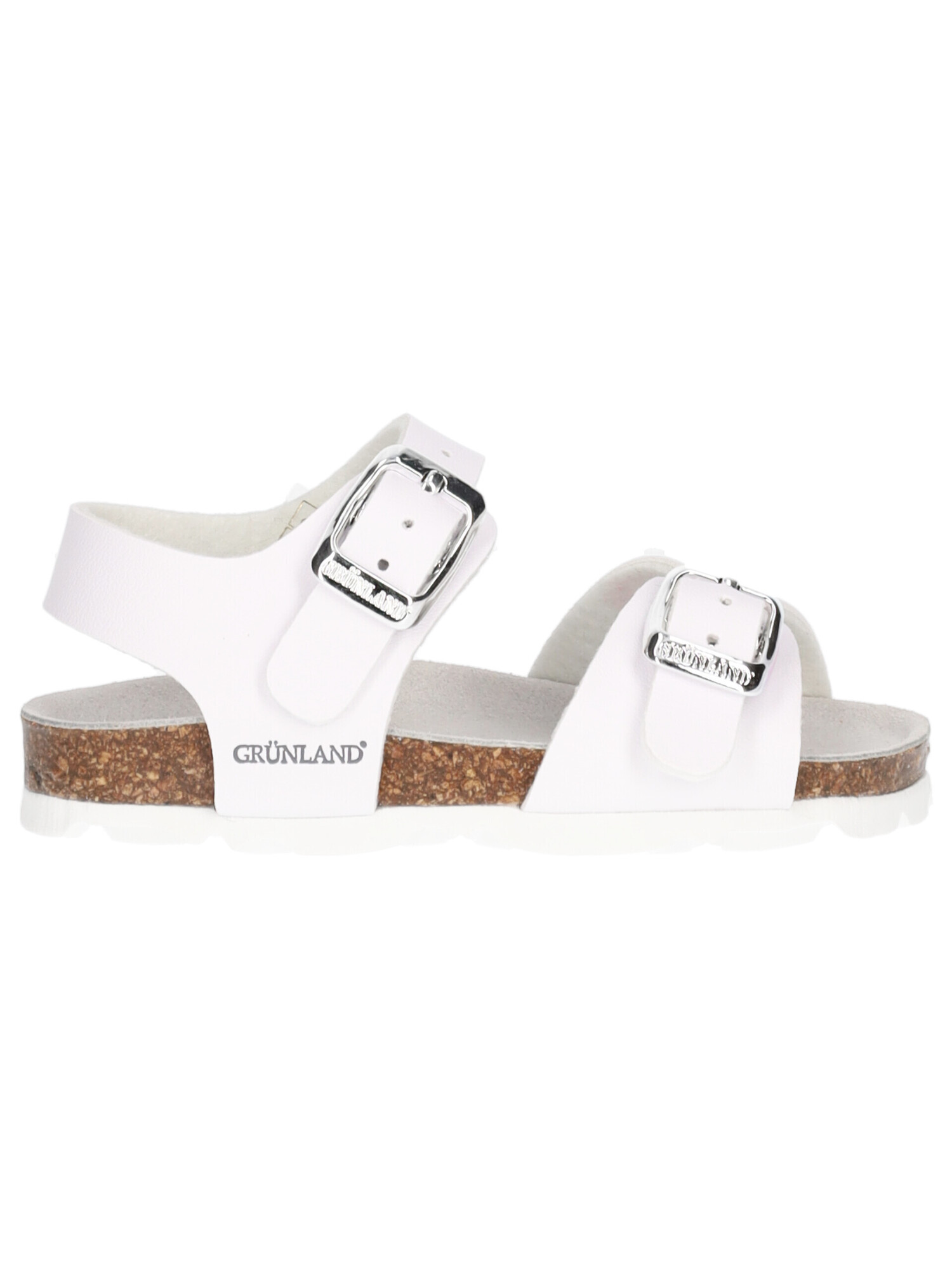 Sandalo Grunland primi passi bambina in ecopelle bianca con doppia fascia regolabile, fodera in tessuto e sottopiede in vera pelle fondo in gomma antiscivolo.