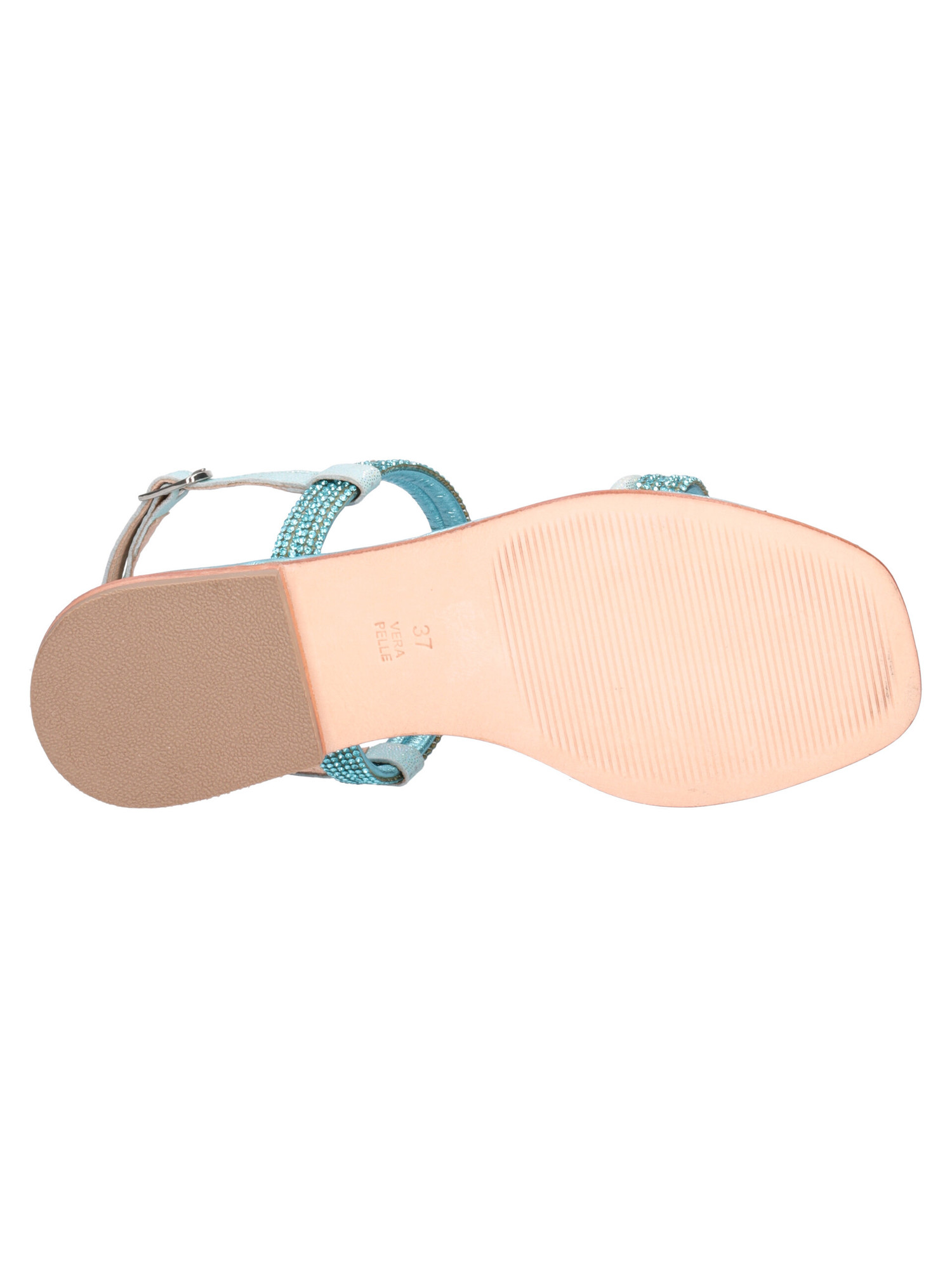 Sandalo Le Chicche da donna in pelle laminata turchese con punta quadrata e strass. Sottopiede sempre in pelle e fondo in vero cuoio.