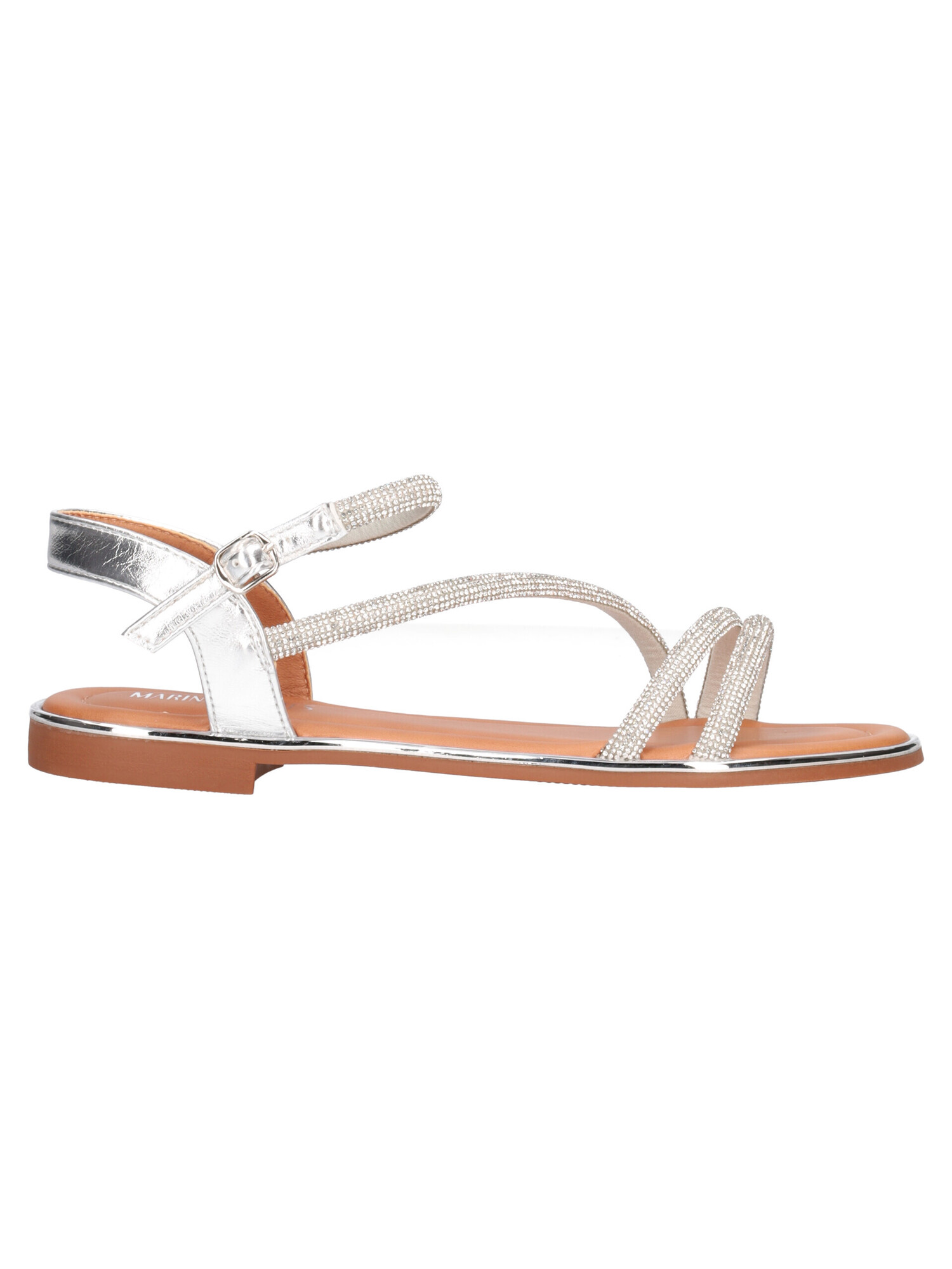 Sandalo Marina Torres da donna in ecopelle laminata argento con strass, sottopiede imbottito sempre in ecopelle e fondo in gomma.