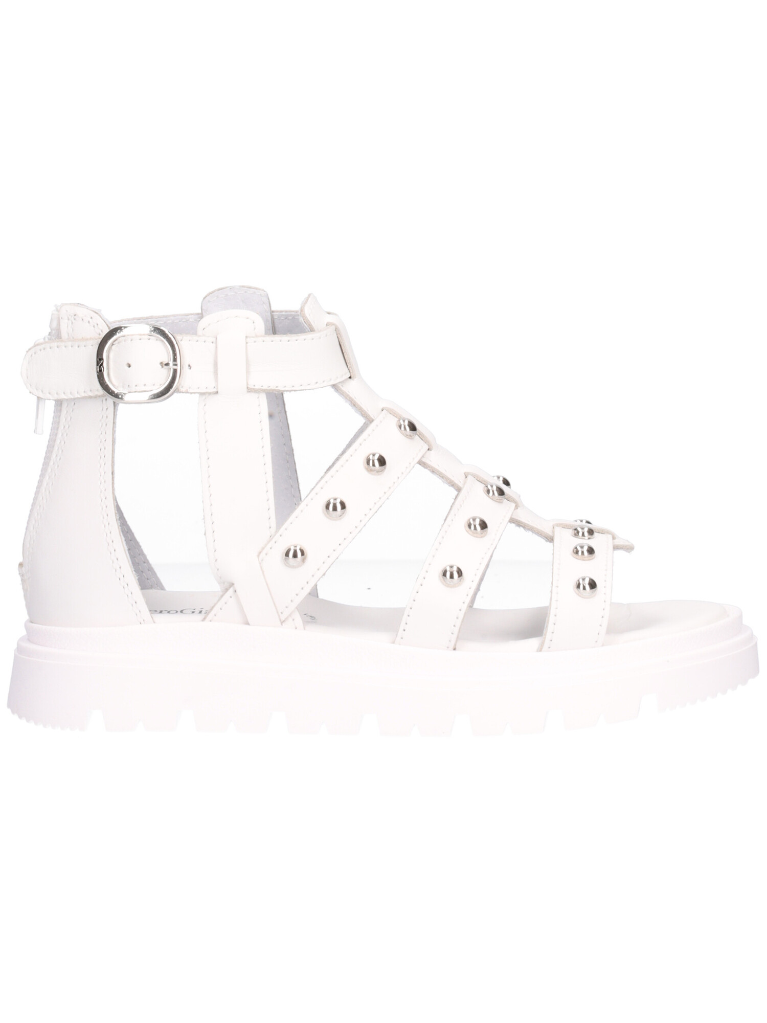 Sandalo Nero Giardini da bambina interamente in pelle bianca con dettagli argento e zip posteriore e fondo in gomma antiscivolo.