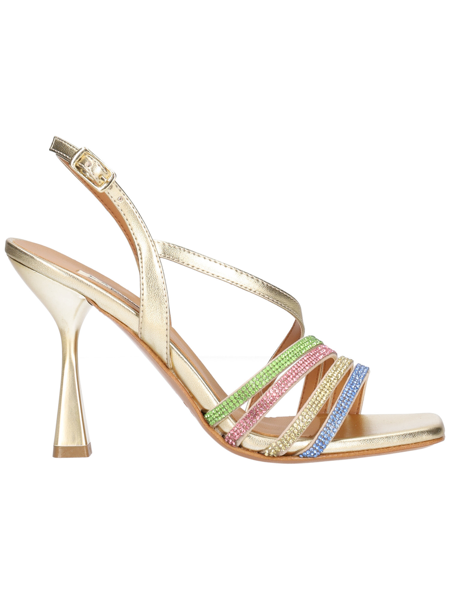 Sandalo elegante L'Amour da donna in ecopelle platino con strass multicolor, sottopiede in pelle e fondo in vero cuoio con tacco di 10cm.