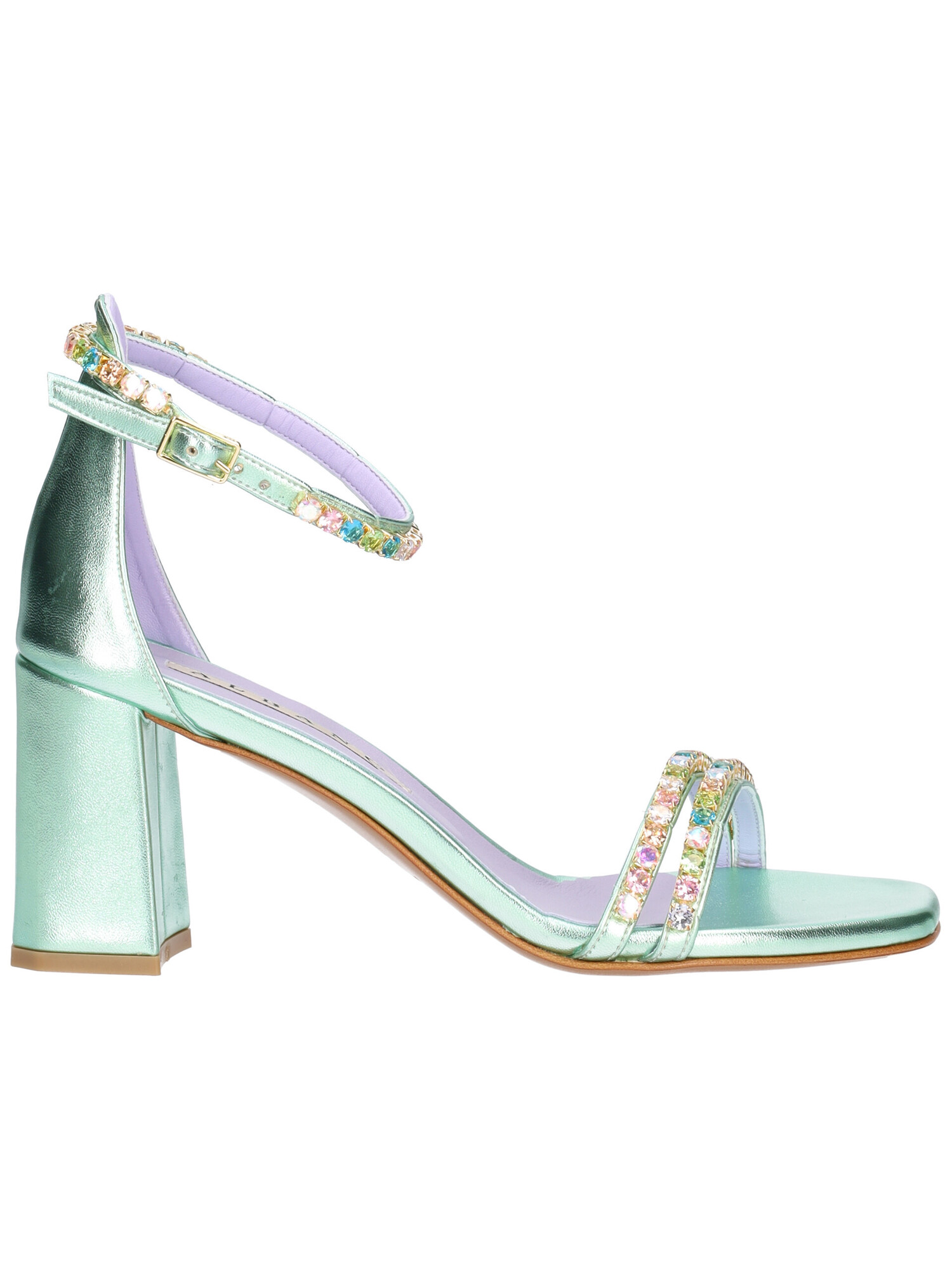 Sandalo Albano da donna in ecopelle verde acqua con pietre multicolor e punta quadrata sottopiede in vera pelle, fondo in cuoio e tacco di 8cm.