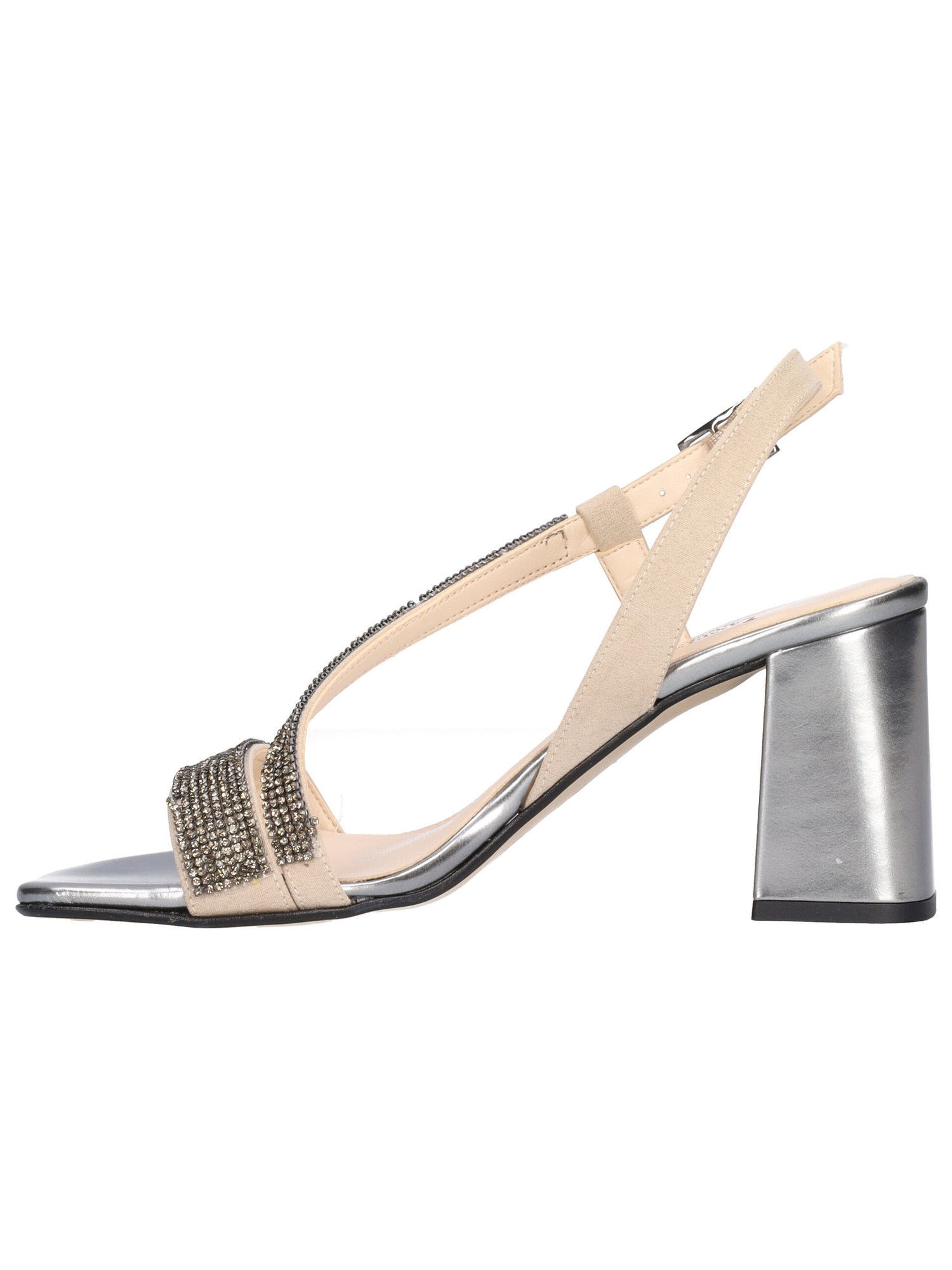 Sandalo tacco largo Liviana da donna in pelle scamosciata beige e similpelle color acciaio con strass in tinta sottopiede in vera pelle e fondo in gomma con tacco di 8cm.