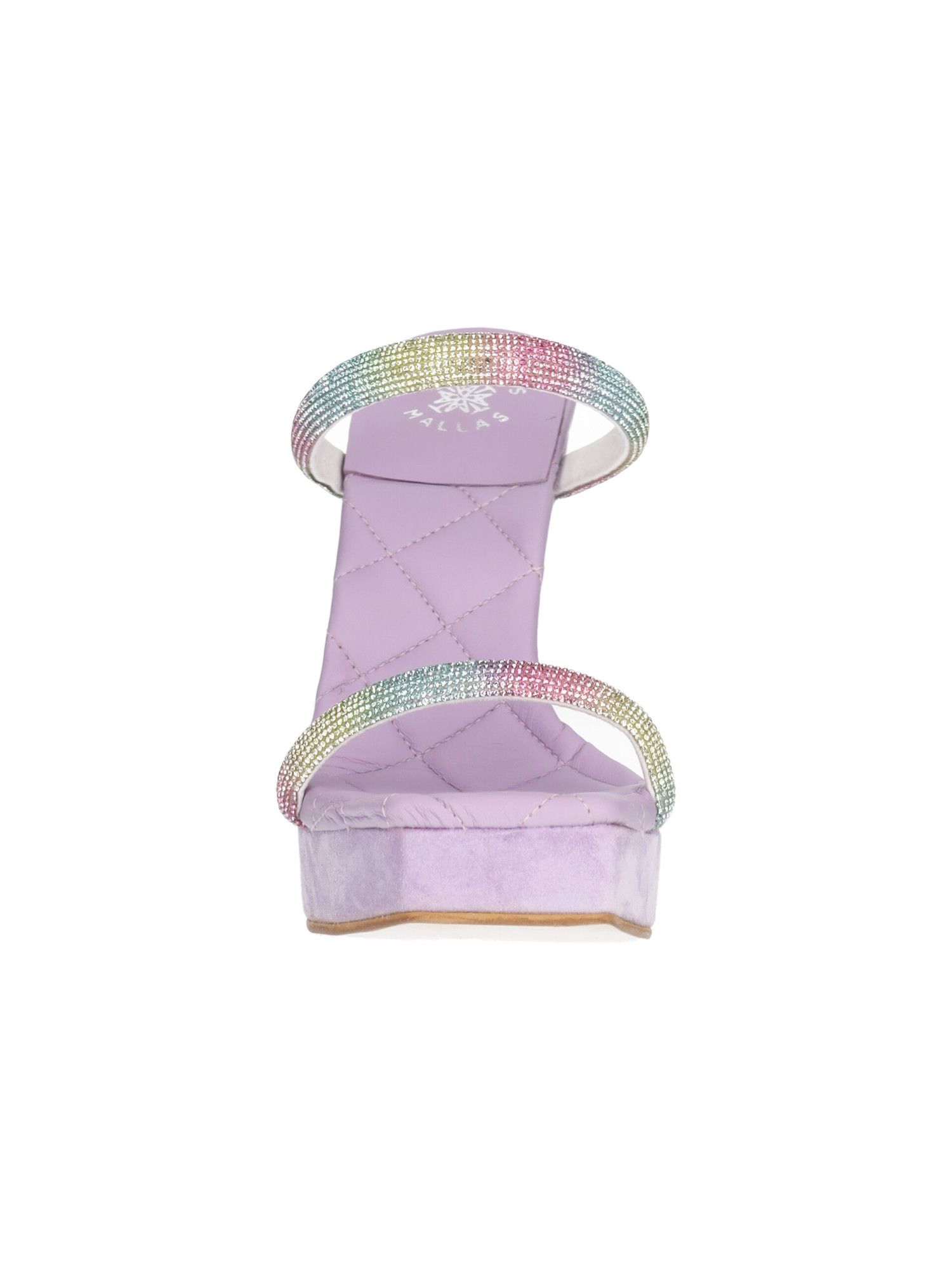 Sabot Tsakiris Mallas da donna in ecopelle lilla con fasce di strass multicolor e punta quadrata fondo in gomma e tacco di 12cm e plateau di 3cm.