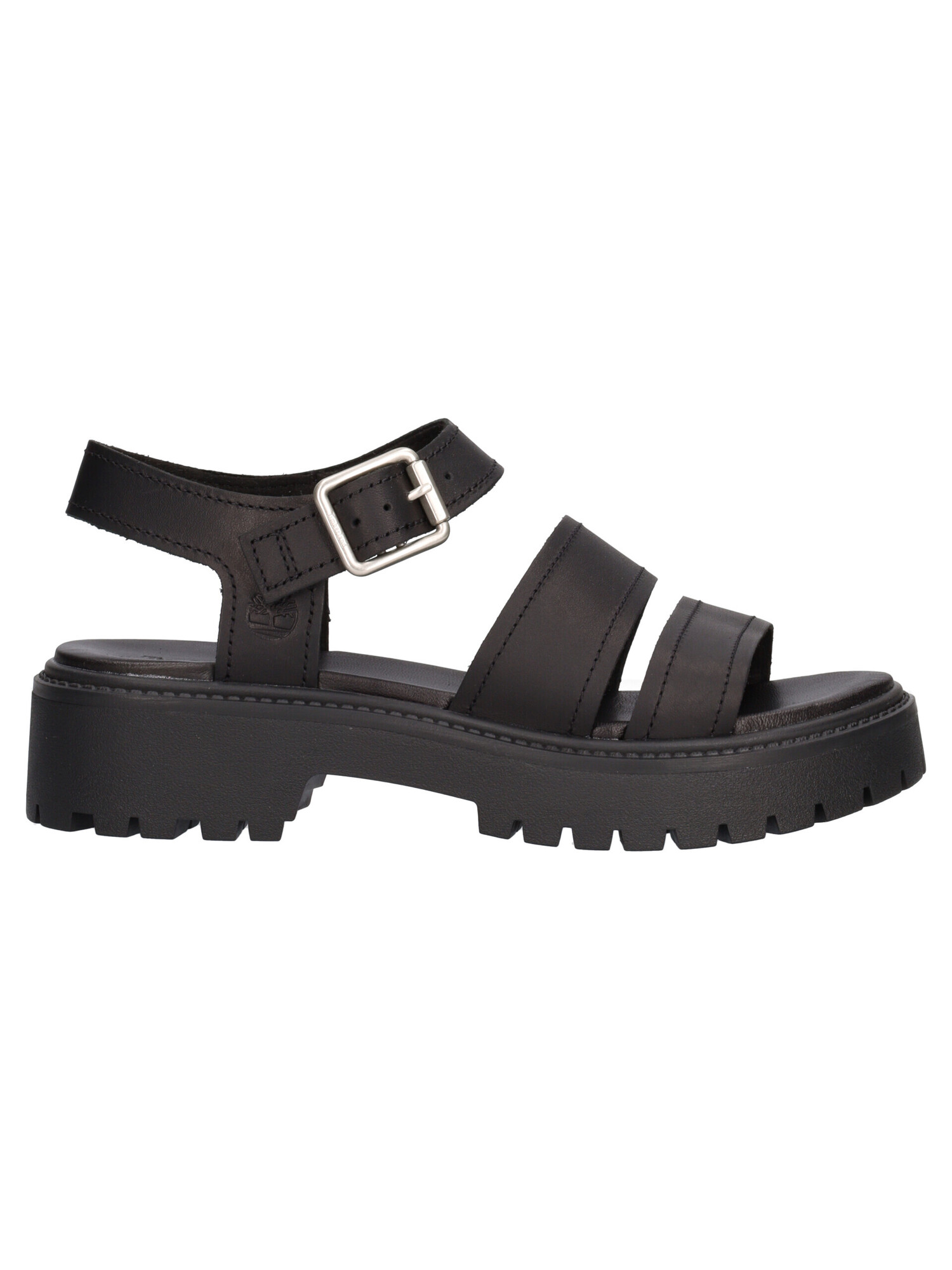 Sandalo Timberland Stone Street da donna in pelle nera con fodera e sottopiede in pelle e tessuto fondo in gomma antiscivolo di 4cm.