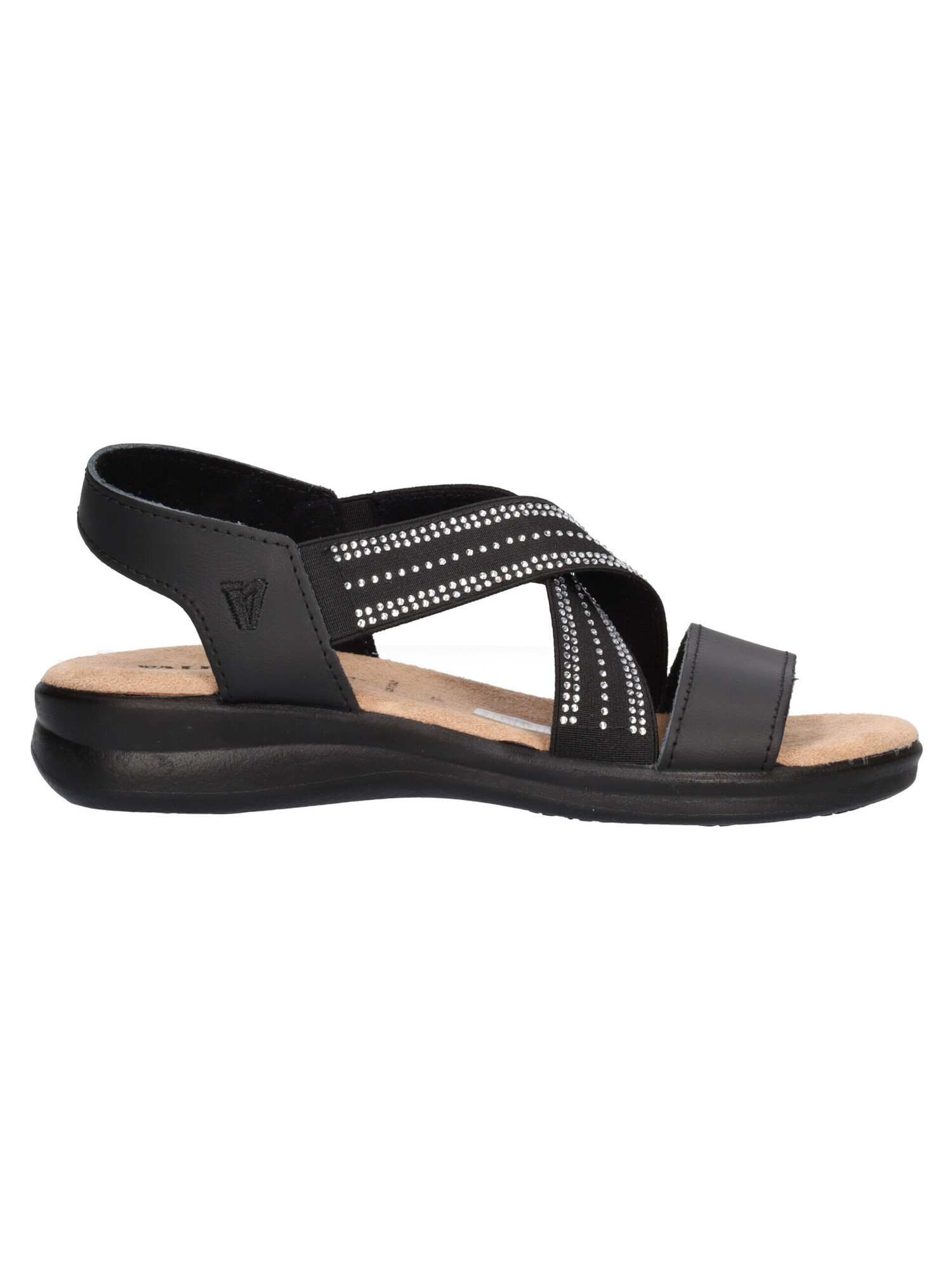 Sandalo Valleverde da donna in pelle nera con fasce elasticizzate con strass, sottopiede imbottito in tessuto e fondo in gomma.
