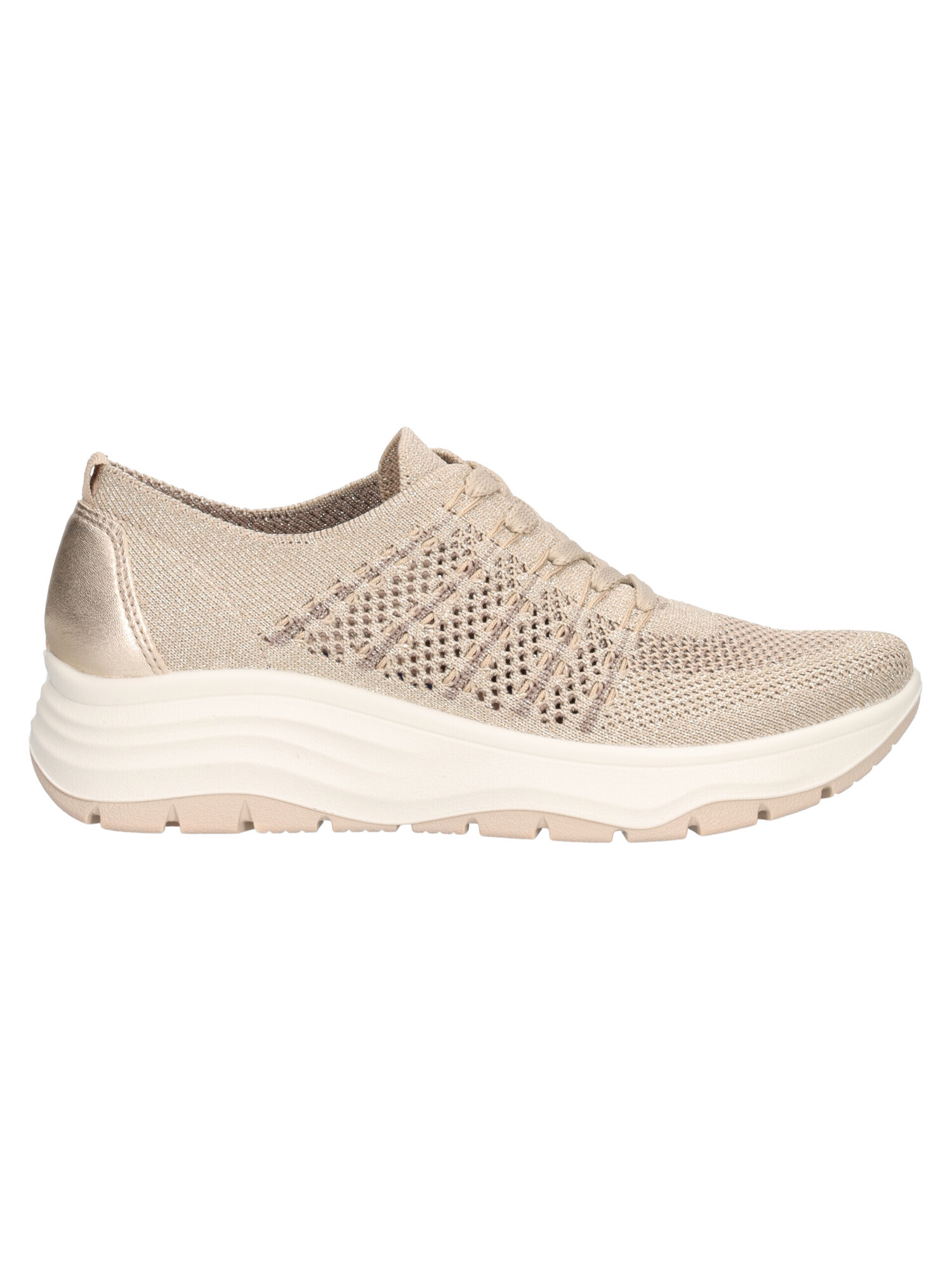 Scarpa casual Enval Soft da donna in tessuto platino con dettagli in lurex, forma ampia, sottopiede estraibile in pelle con memory foam, fondo in gomma e zeppa di 4cm.
