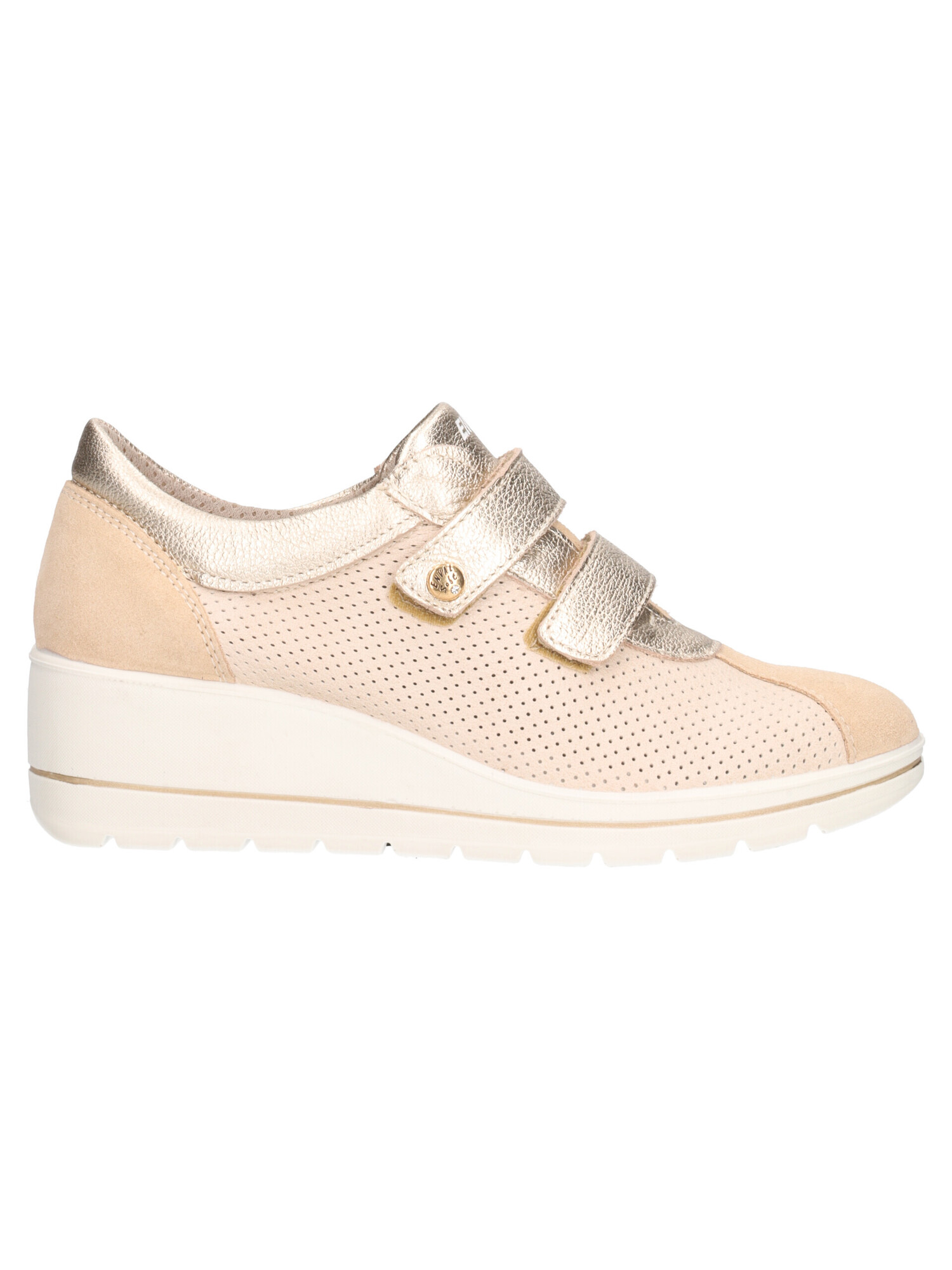 Scarpa casual Enval Soft da donna in pelle platino e beige con dettagli scamosciati, fodera in tessuto e sottopiede estraibile in pelle con memory foam fondo in gomma con zeppa di 5cm.