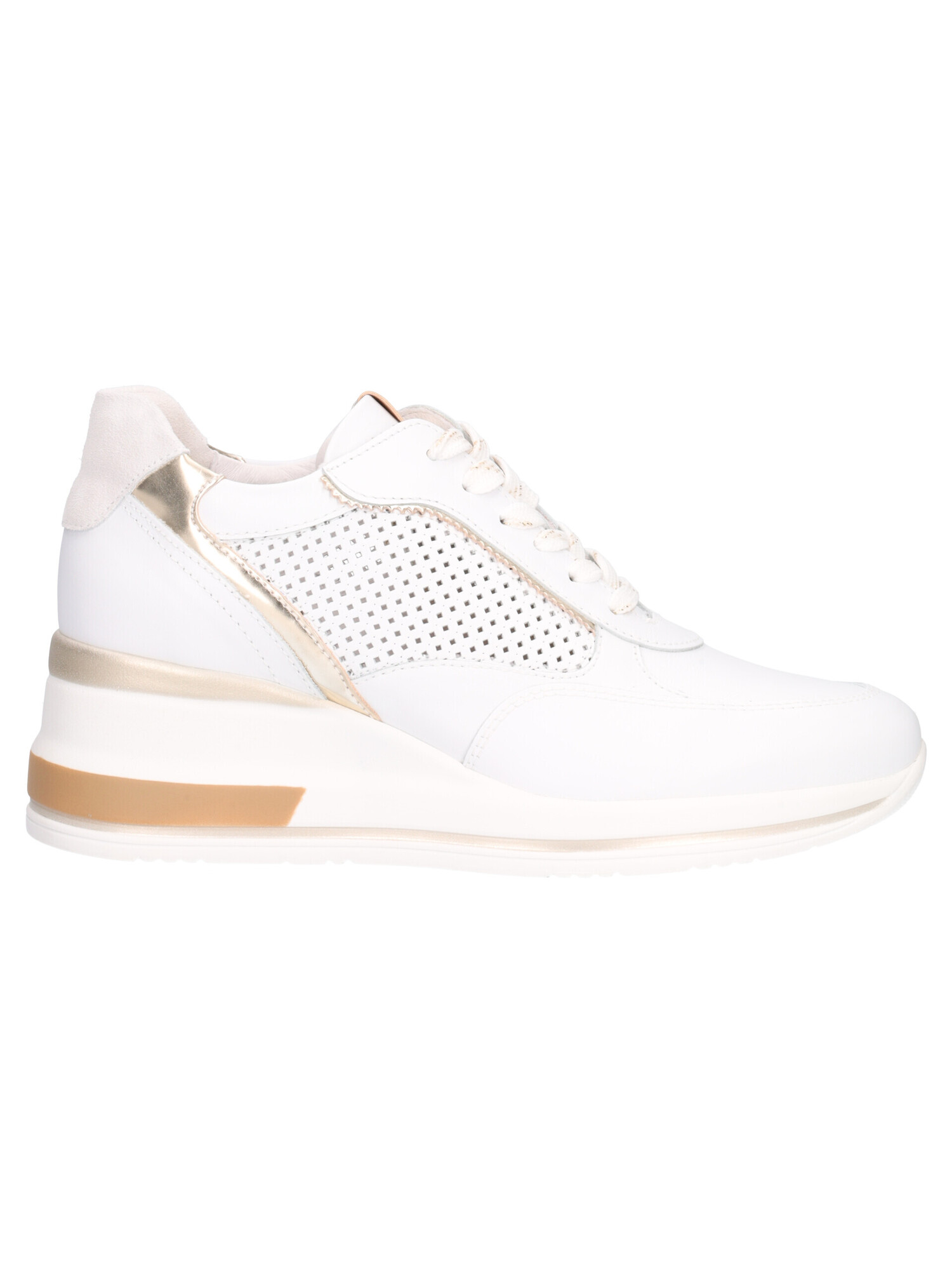 Scarpa casual Nero Giardini da donna in pelle bianca con dettaglio laterale traforato, fodera e sottopiede estraibile in pelle con memory foam fondo in gomma con zeppa di 6cm.