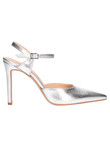 Scarpa a punta Liviana da donna in ecopelle laminata argento con sottopiede in vera pelle, fondo in gomma e tacco di 10cm.