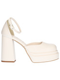 Scarpa Liviana da donna in raso lilla con punta quadrata e cinturino regolabile a caviglia. Sottopiede in vera pelle e fondo in gomma con tacco di 11cm e plateau di 3,5cm.