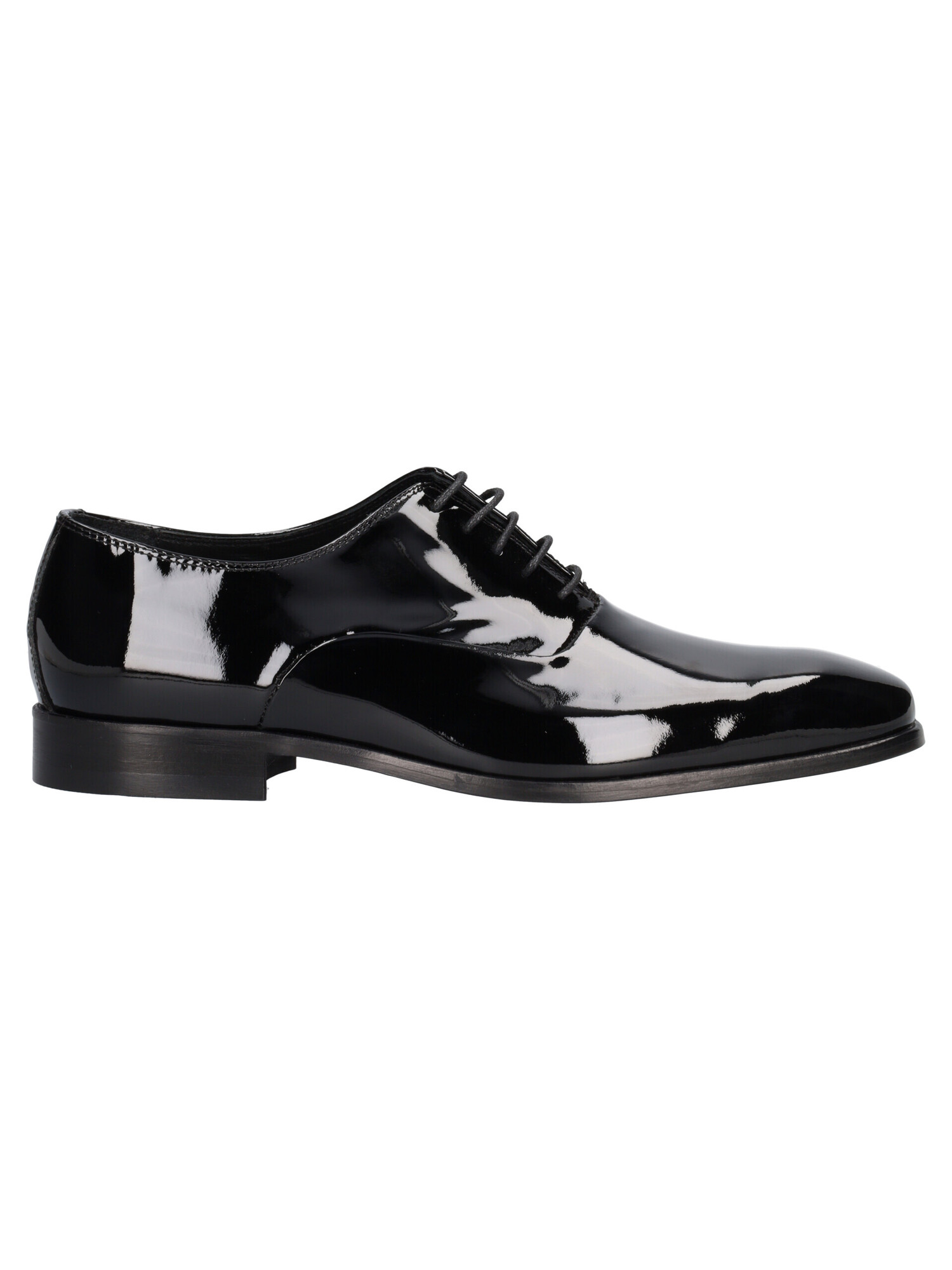Scarpa elegante Mercanti Fiorentini da uomo in vernice nera con fodera e sottopiede in pelle e fondo in vero cuoio.