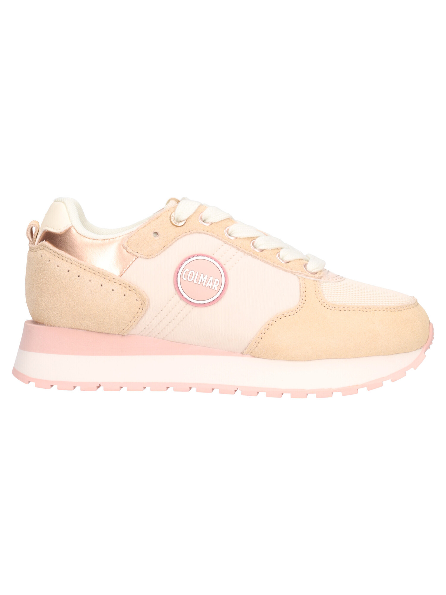 Sneaker Colmar da donna in tessuto e pelle scamosciata beige con fodera e sottopiede estraibile in tessuto e fondo in gomma antiscivolo di 4cm.