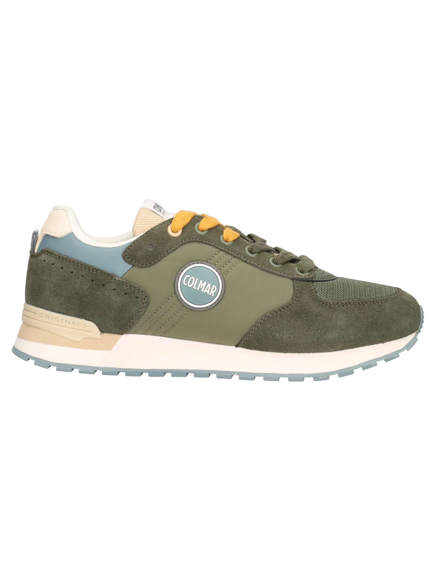 Sneaker Colmar da uomo in pelle scamosciata e tessuto verde con doppio laccio disponibile come si vede in foto fodera e sottopiede estraibile in tessuto e fondo in gomma antiscivolo.