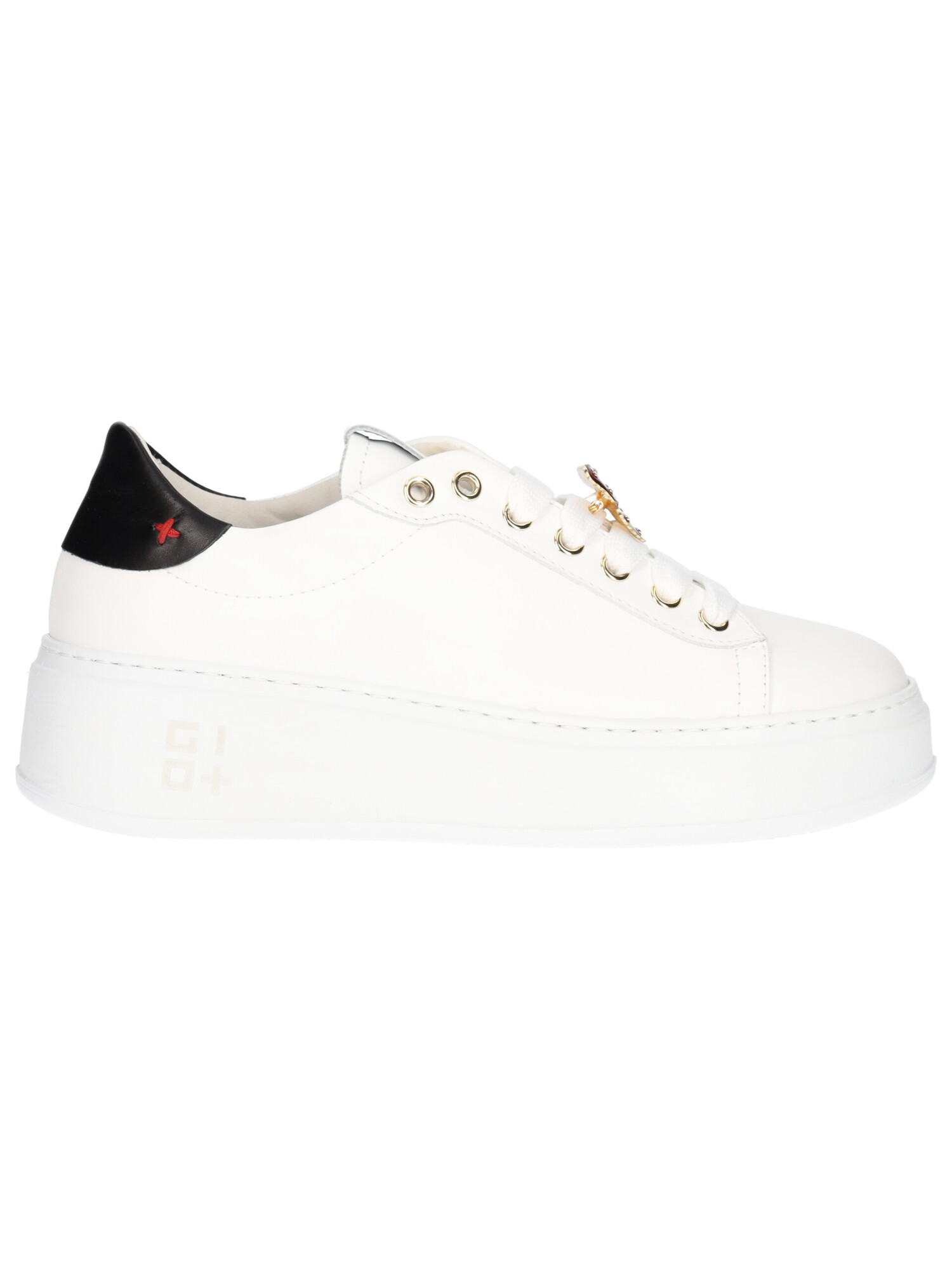 Sneaker Gio+ da donna in pelle bianca con dettagli dorati, charm e spilla farfalla. Scarpa con colletto bicolore: uno verde ed uno nero sottopiede estraibile in pelle e fondo in gomma antiscivolo con platform di 4cm.