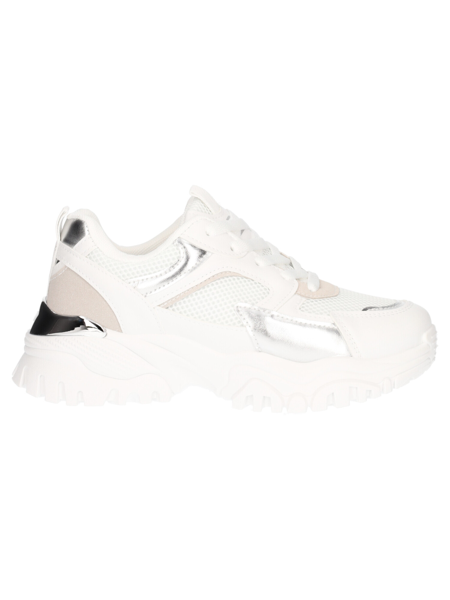 Sneaker Laura Biagiotti da donna in tessuto ed ecopelle bianca con dettagli a contrasto fodera e sottopiede estraibile in tessuto, fondo in gomma con platform di 5cm.