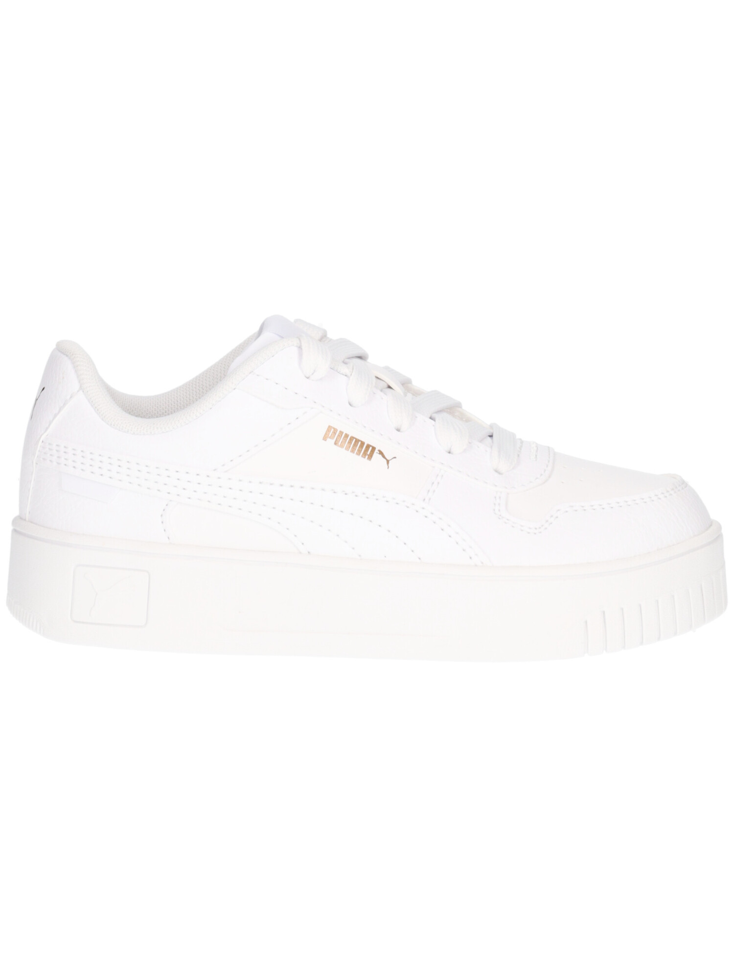 Sneaker Puma Carina da bambina in ecopelle bianca con fodera e sottopiede estraibile in tessuto e fondo in gomma.