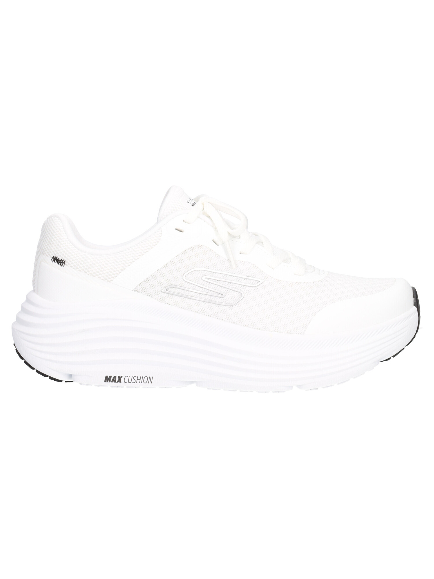 Sneaker Skechers Max Cushion da donna in tessuto bianco con dettagli in ecopelle, fodera e sottopiede sempre in tessuto e fondo in gomma antiscivolo di 5cm.