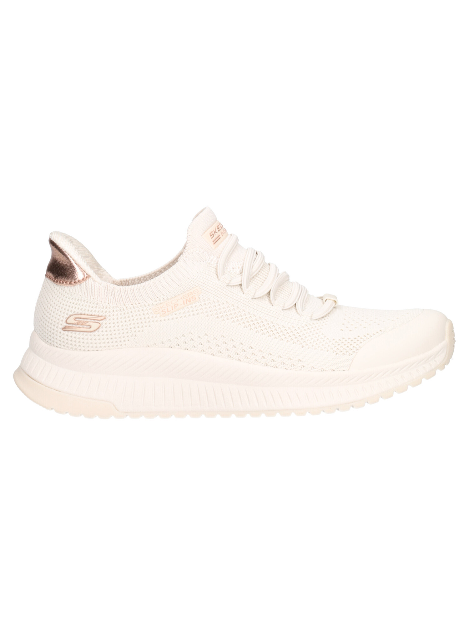 Sneaker Skechers Slip-Ins Bobs Vegan da donna in tessuto avorio con calzante incorporato dietro al tallone in modo tale da calzare la scarpa in modo rapido. Finto laccio elastico, sottopiede con memory foam e fondo in gomma antiscivolo lavabili in lavatrice.