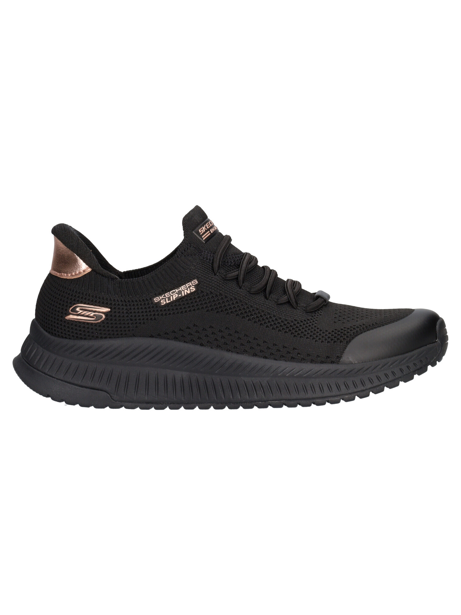 Sneaker Skechers Slip-Ins Bobs Vegan da donna in tessuto nero con calzante incorporato dietro al tallone in modo tale da calzare la scarpa in modo rapido. Finto laccio elastico, sottopiede con memory foam e fondo in gomma antiscivolo lavabili in lavatrice.