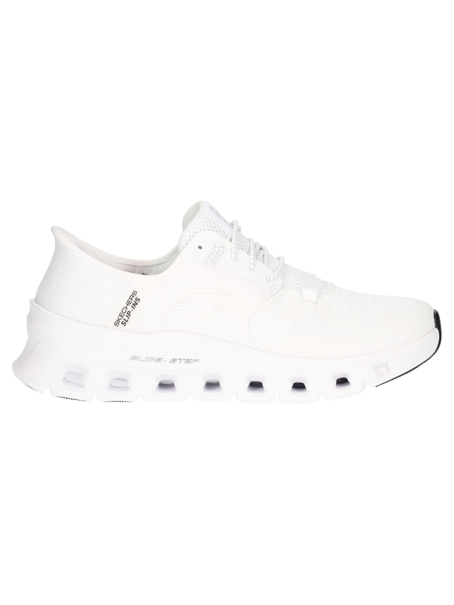 Sneaker Skechers Slip-Ins da uomo in tessuto bianco con fodera e sottopiede imbottito sempre in tessuto sistema slip ins che permette di infilare la scarpe senza chinarsi grazie al "calzante" posteriore. Fondo in gomma antiscivolo lavabili in lavatrice.