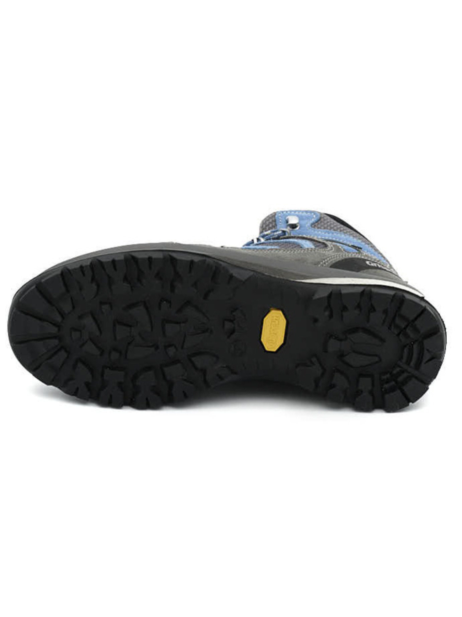 Scarpa in morbida pelle scamosciata grigia e azzurra con inserti in tessuto e allacciatura a contrasto. Foderata da una membrana protettiva Gritex per una maggior resistenza ad acqua, vento e freddo. Sottopiede estraibile in tessuto traspirante e fondo in gomma antiscivolo Vibram. Made in Italy.